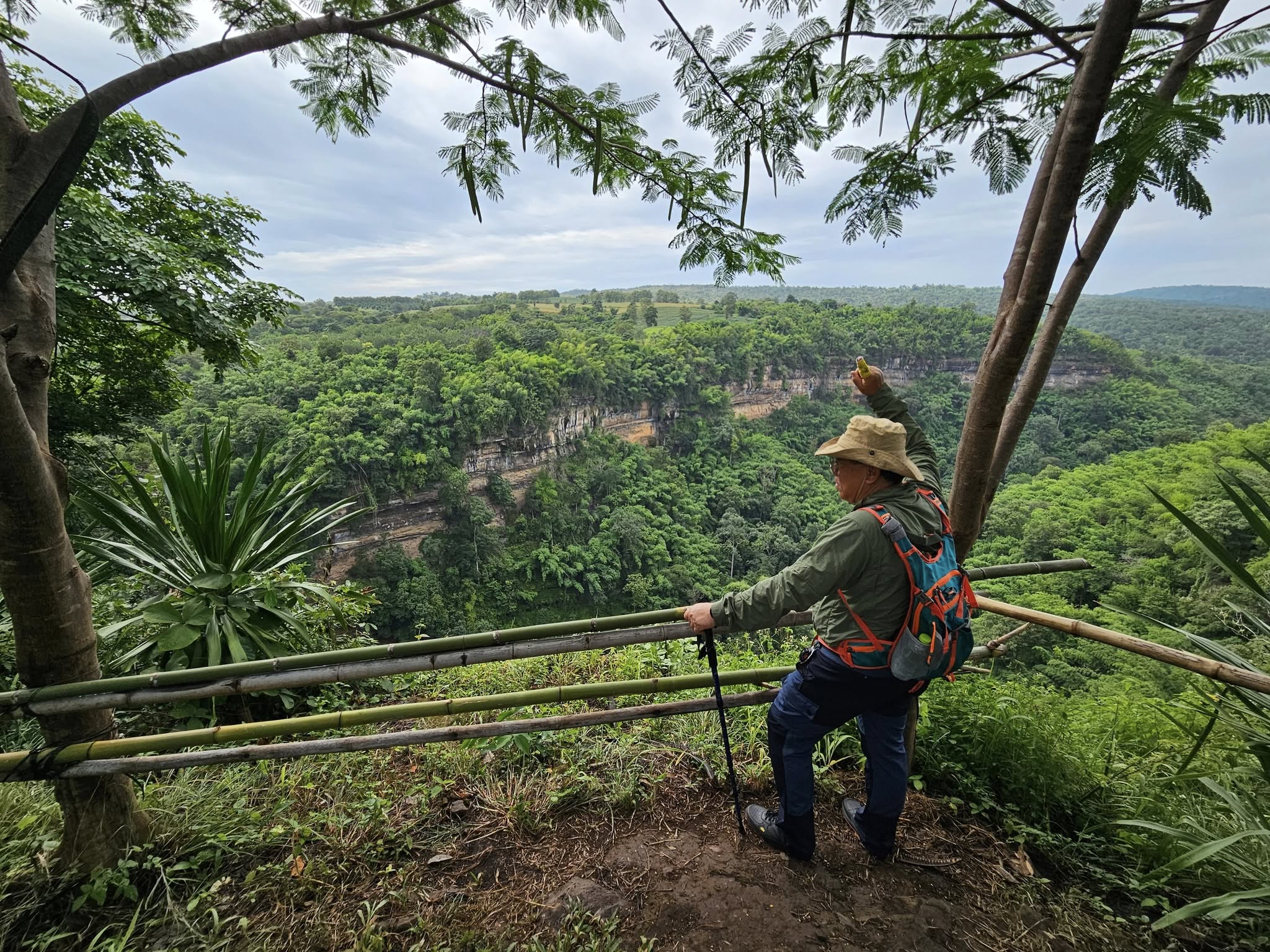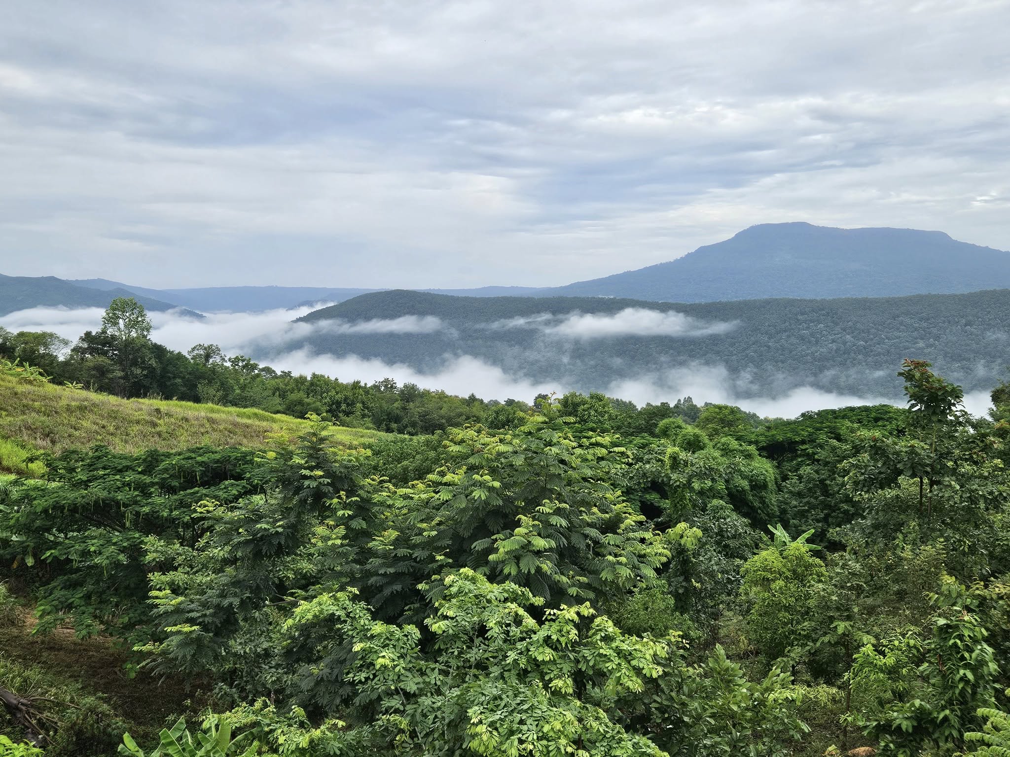 ยอดเขาแบนๆ นั่นคือ ภูผาจิต แนวสันเขาที่วางขวางคือ สันเขา สันกงเกวียน อันเขียวชอุ่ม ดูแล้วสดชื่น