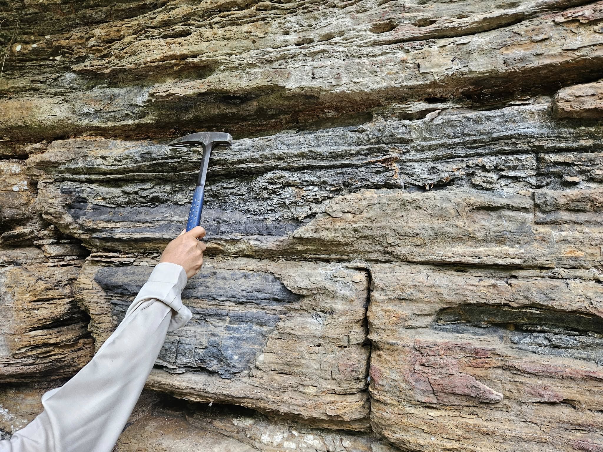 หิน Calcareous shale หินดินดานที่มีส่วนแระกอบของแคลเซียมคาร์บอเนต ที่หยดกรดฟู่ ชั้นบางๆ ซ้อนกันหลายชั้นมากมาย