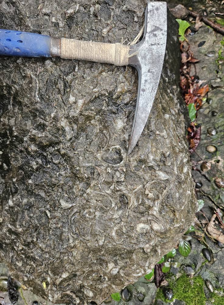 และเมื่อเขี่ยๆดูหินที่ประสานตัวหอยเข้าด้วยกัน พบว่าเป็นหินทรายเม็ดไม่เล็ก และบางครั้งก็มีก้อนกรวดเล็กๆด้วย และ การวางตัวของเปลือกหอย หรือตัวหอย ก็ไม่เป็นระเบียบ มีพลิกคว่ำพลิกหงาย บางตัวก็เอาสันขึ้นบนก็มี เหมือนกับวางตัวระเก่ะระก่ะ จึงสมควรที่จะฟันธงได้ว่า มันน่าจะเป็นการไหลของแม่น้ำแบบท่วมกระทันหันพัดพาเอาหอยโชคร้ายจำนวนมาก มาพร้อมกับเม็ดทราย มากองกันไว้ในตำแหน่งนี้ ดูๆแล้ว น่าจะกองหนาสัก 3-4 เมตร เห็นจะได้