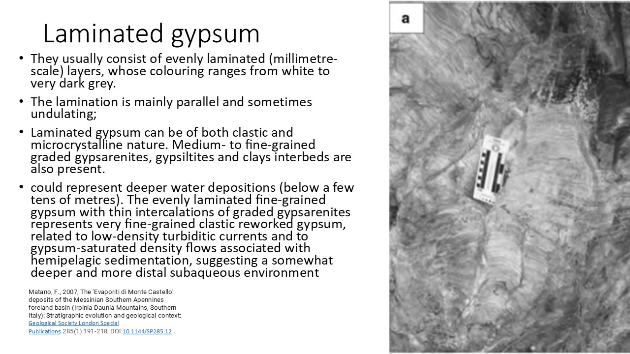 Gypslaminate เป็นแร่ยิปซัมเนื้อทราย ส่วนใหญ่ประกอบด้วยแร่ยิปซัมชนิดแร่ alablaster เม็ดขนาดเล็กกว่า 0.2 มม. ลักษณะคล้ายน้ำตาลก้อนสำหรับใส่กาแฟ แต่มีการเรียงตัวของเม็ดแร่เป็นแถบขนาด 2-5 มม. ขนานกันจากล่างขึ้นบน