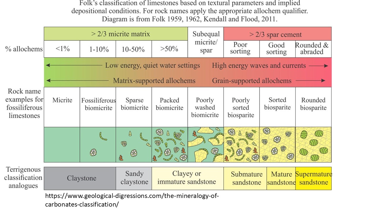 การจำแนกชนิดหินคาร์บอเนต ในปัจจุบันนิยมใช้การจำแนกแบบ Folk Classification และ Dunham Classification