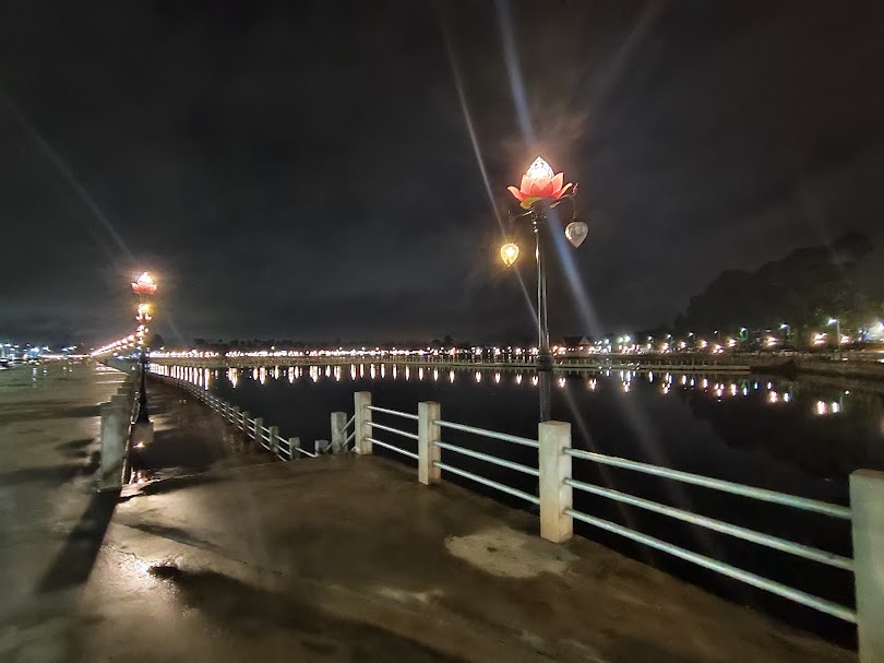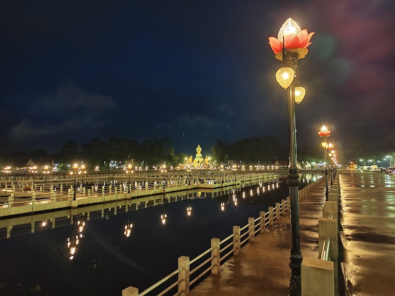 เมื่อตะวันลับขอบฟ้า สวนสาธารณะแห่งนี้กลับมีชีวิตชีวาขึ้นอีกครั้งด้วยแสงไฟระยิบระยับจากร้านอาหารมากมายที่รายล้อม เปิดเป็นเทศกาลแห่งรสชาติและเสียงหัวเราะ ผู้คนจากทั่วสารทิศมารวมตัวกันเพื่อลิ้มลอง "หมูกระทะ" และ "จิ้มจุ่ม" อันเลื่องชื่อ กลิ่นหอมของเนื้อย่างและน้ำซุปเดือดพล่านคลุ้งไปทั่วบริเวณ เคล้าคลอไปกับเสียงเพลงบรรเลงเบาๆ ที่ถูกคัดสรรมาอย่างดี เพื่อสร้างสรรค์บรรยากาศแห่งการผ่อนคลายและสังสรรค์ น้ำพุหลากสีสันพวยพุ่งขึ้นสู่ท้องฟ้า ย้อมค่ำคืนให้งดงามราวกับอยู่ในห้วงฝัน เป็นภาพที่ตราตรึงใจผู้มาเยือนมิรู้ลืม ห้วยวังนองจึงไม่ใช่เพียงแค่สวนสาธารณะ แต่เป็นดั่งปอดและหัวใจของชาวอุบลฯ เป็นสถานที่ที่เชื่อมโยงผู้คนเข้าไว้ด้วยกัน ผ่านกิจกรรมยามว่าง อาหารรสเลิศ และความงดงามของธรรมชาติ ที่นี่ คุณจะได้สัมผัสกับเสน่ห์อันแท้จริงของอุบลราชธานี ที่ซึ่งชีวิตเมืองผสานเข้ากับความสงบของธรรมชาติได้อย่างลงตัว และที่ซึ่งทุกย่างก้าวคือการค้นพบความสุขเล็กๆ น้อยๆ ในแต่ละวัน