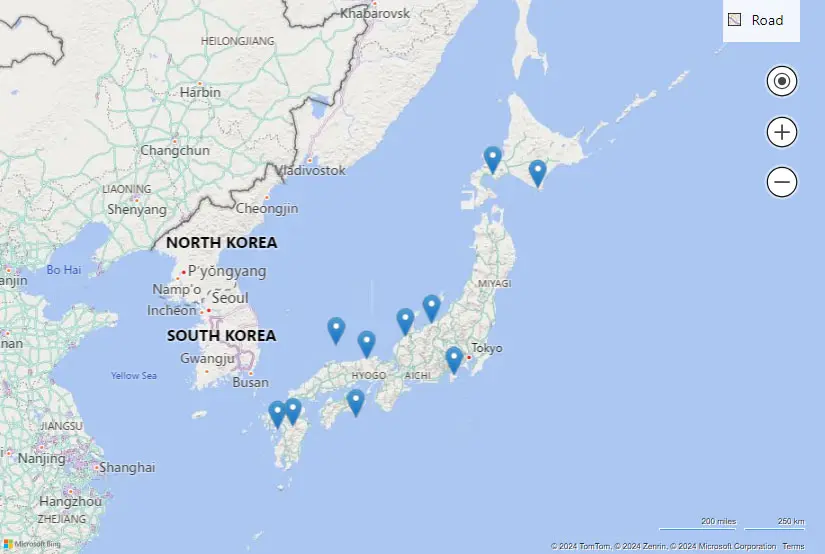 แผนที่แสดงตำแหน่งที่ตั้ง UNESCO Global Geopark ในประเทศญี่ปุ่น