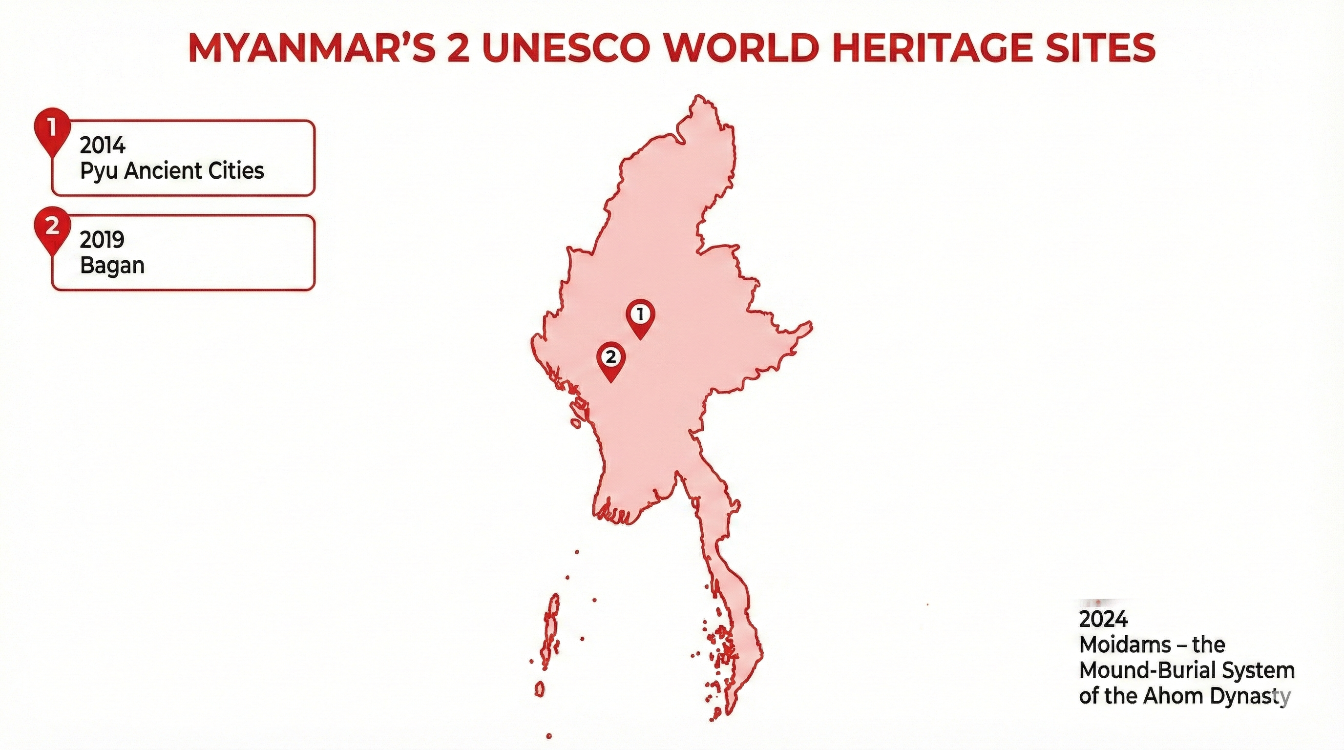 องค์การเพื่อการศึกษาวิทยาศาสตร์และวัฒนธรรม แห่งสหประชาชาติ (UNESCO) ได้ขึ้นทะเบียน แหล่งมรดกโลก (World Heritage Site) ของประเทศ Myanmar ได้แก่