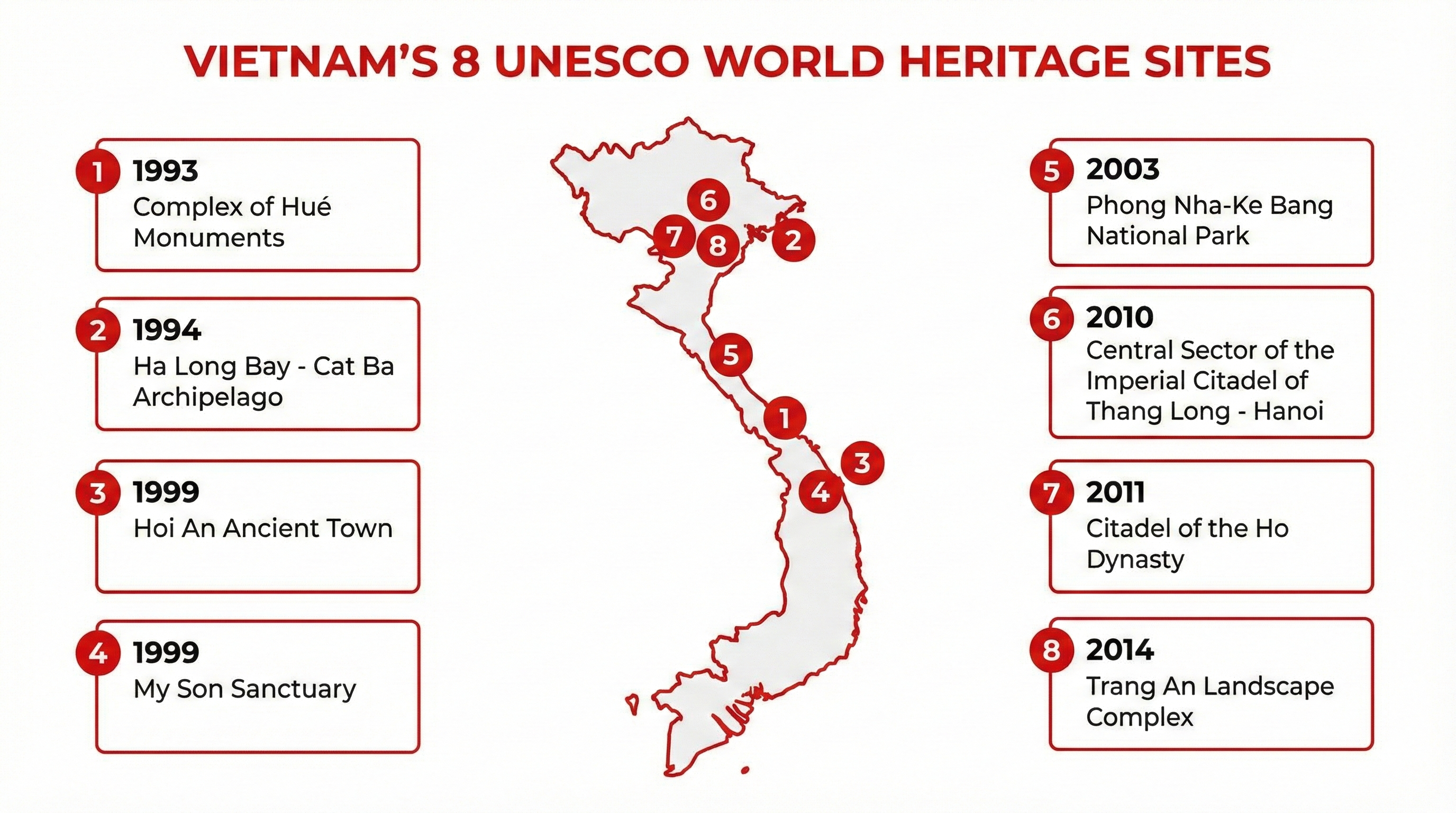 องค์การเพื่อการศึกษาวิทยาศาสตร์และวัฒนธรรม แห่งสหประชาชาติ (UNESCO) ได้ขึ้นทะเบียน แหล่งมรดกโลก (World Heritage Site) ของประเทศ Viet Nam ได้แก่