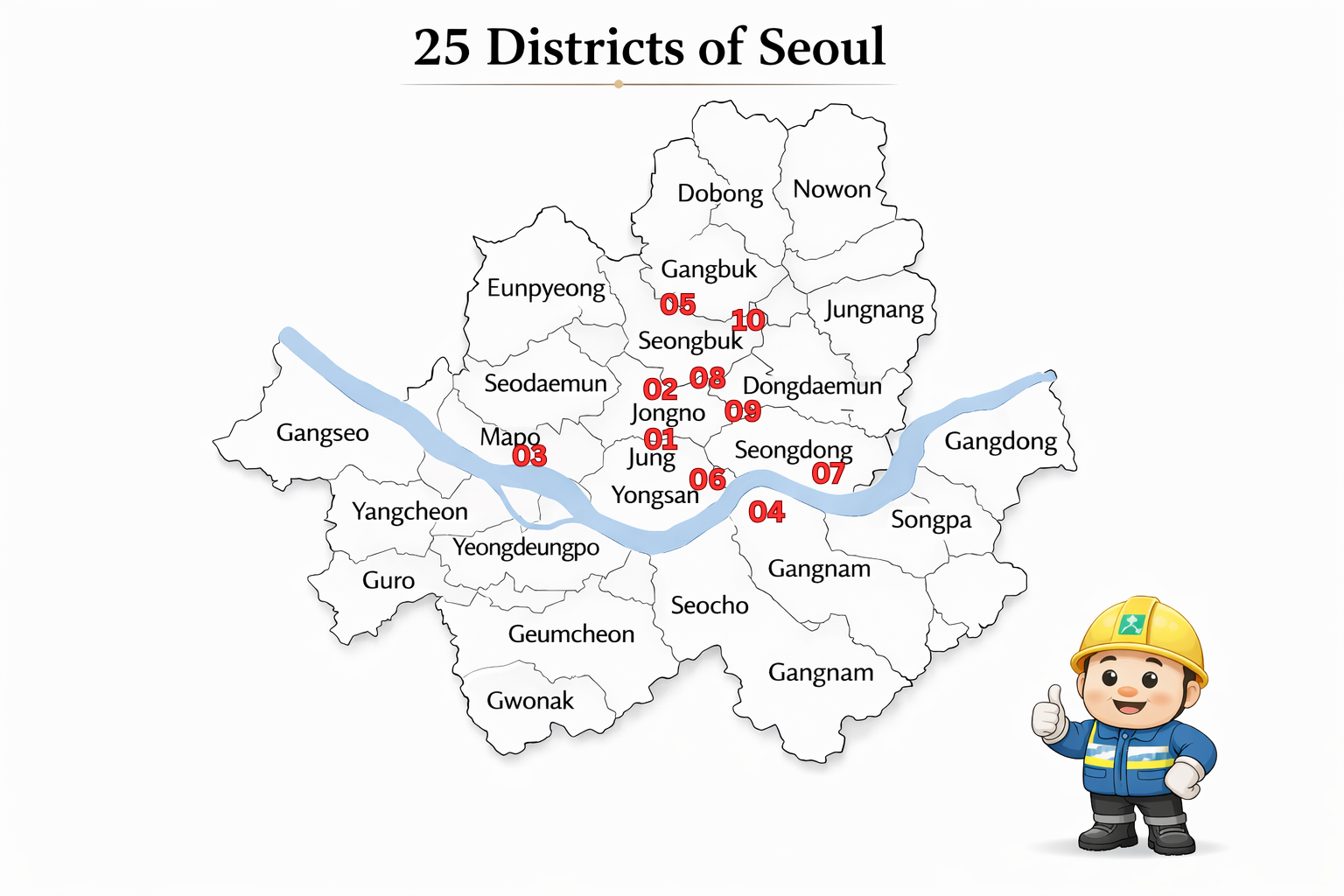 โซลตั้งอยู่ริมสองฝั่งแม่น้ำฮัน โดยมีการจัดกลุ่มย่านท่องเที่ยวสำคัญตามลักษณะทางวัฒนธรรมและการใช้งาน ย่านในฝั่งเหนือ (Jung-gu, Jongno-gu) มักสะท้อนคุณค่าทางประวัติศาสตร์และศิลปะแบบดั้งเดิม ในขณะที่ฝั่งใต้ (Gangnam-gu) สะท้อนความล้ำสมัยและเศรษฐกิจระดับสูง การเข้าใจบริบทของแต่ละย่านจะช่วยให้ผู้เดินทางสามารถวางแผนการเข้าชมได้อย่างมีประสิทธิภาพและตรงตามความสนใจส่วนบุคคล ไม่ว่าจะเป็นสายกิน สายถ่ายรูป หรือสายช้อปปิ้ง ซึ่งแต่ละย่านล้วนมี "วิญญาณของเมือง" (Soul of the City) ที่แตกต่างกันอย่างสิ้นเชิง