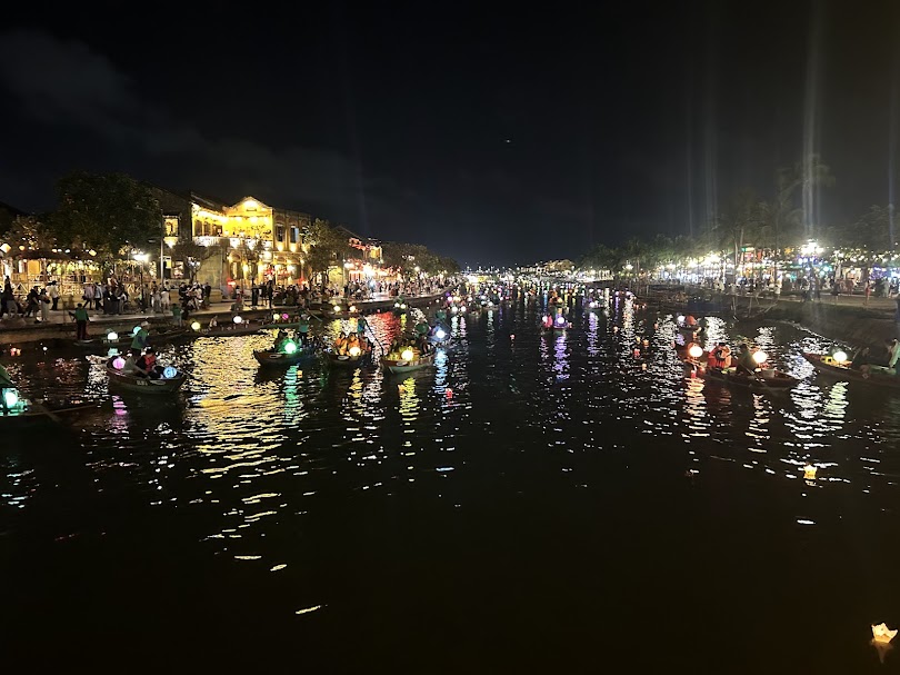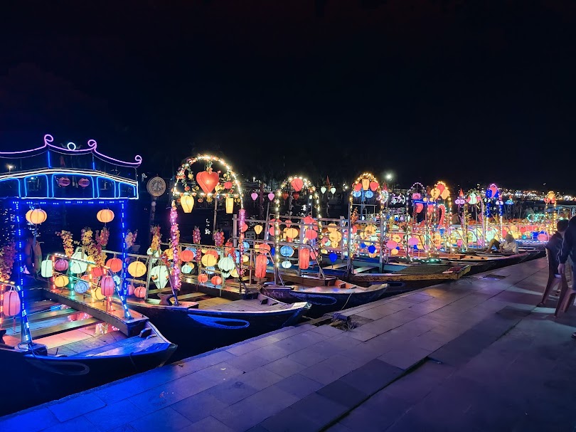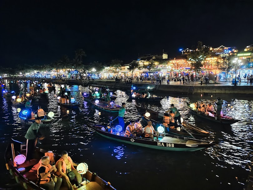 ห่างจากตลาดเพียงไม่กี่ก้าว คือท่าเรือสำหรับ การล่องเรือในแม่น้ำหวัย (Hoai River Boat Rides) เรือไม้ลำเล็กๆ จะพาผู้มาเยือนล่องไปตามสายน้ำเป็นเวลาประมาณ 15-20 นาที เพื่อชมทัศนียภาพของเมืองเก่าที่ส่องสว่างด้วยโคมไฟจากมุมมองที่แตกต่างออกไป ประเพณีที่ฝังรากลึกในความเชื่อท้องถิ่นคือการซื้อโคมกระดาษพร้อมเทียนไขเพื่อนำไปลอยลงสู่แม่น้ำพร้อมอธิษฐานขอพร การลอยโคมลงแม่น้ำเปรียบเสมือนการส่งความปรารถนาดีและความหวังลงไปกับสายน้ำ เป็นประสบการณ์ที่เต็มไปด้วยความสงบและเปี่ยมด้วยความหมาย ทำให้ค่ำคืนในฮอยอันเป็นที่น่าจดจำยิ่งขึ้น