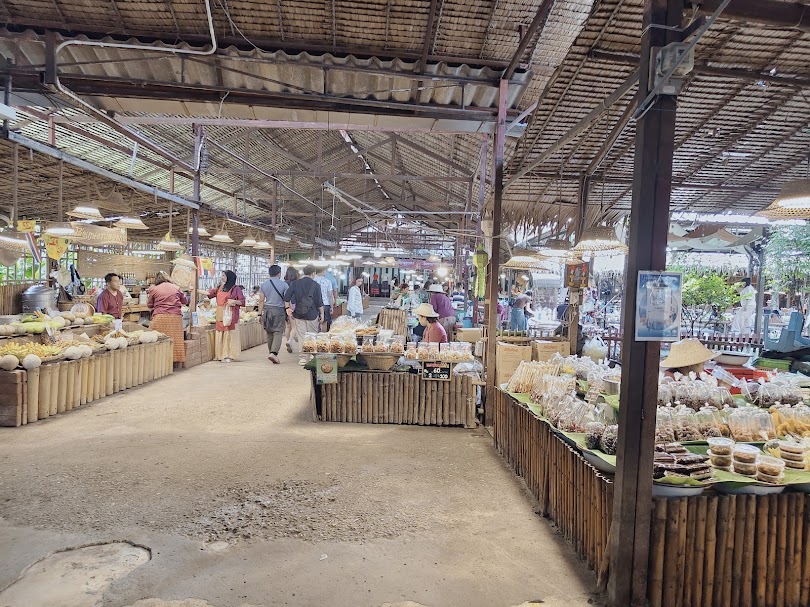 ความโดดเด่นที่สร้างชีวิตชีวาให้กับตลาดแห่งนี้คือพ่อค้าแม่ค้าที่พร้อมใจกันแต่งกายด้วยชุดไทยย้อนยุคสีม่วงเปลือกมังคุด ซึ่งเป็นสีสันที่สื่อถึงความสง่างามและความเป็นไทยโบราณ การแต่งกายนี้ไม่เพียงแต่เป็นเครื่องแบบ แต่เป็นส่วนหนึ่งของการสร้างประสบการณ์ที่สมจริง พ่อค้าแม่ค้าเหล่านี้ไม่ได้เป็นเพียงผู้ขายสินค้า แต่เป็นผู้เล่าเรื่องราวและเป็นส่วนหนึ่งของภาพวาดที่มีชีวิต พวกเขาจะทักทายลูกค้าด้วยรอยยิ้มอันเป็นมิตรและน้ำเสียงที่อบอุ่น ชวนให้รู้สึกเหมือนได้ย้อนเวลากลับไปสนทนากับผู้คนในสมัยก่อนอย่างแท้จริง เสียงเจื้อยแจ้วของการต่อรองราคา เสียงหัวเราะ และเสียงดนตรีไทยที่บรรเลงคลอเบาๆ ล้วนสร้างความประทับใจและความทรงจำที่มิอาจลืมเลือน