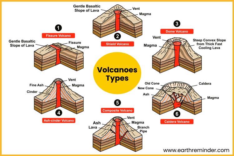แม้ว่าภูเขาไฟทั้งหมดในโลกจะมีลาวา เถ้าถ่าน และก๊าซเหมือนกัน แต่หากพิจารณาถึงวิธีการเกิดและรูปร่างแล้ว นักภูเขาไฟวิทยาแบ่งภูเขาไฟออกได้เป็น 6 ชนิด (ภาพที่ 1) ดังต่อไปนี้
