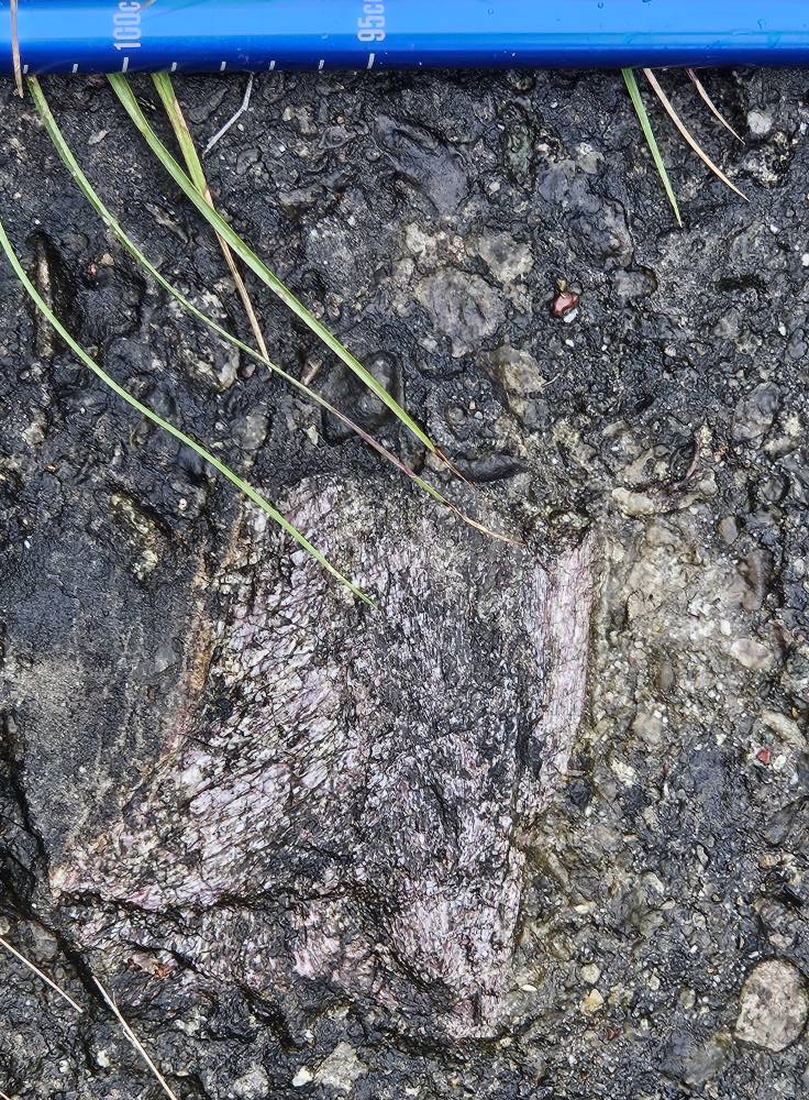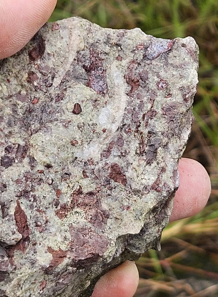 จะเรียกว่าหินอะไรดีน่ะ แต่น่าจะเป็น หินทรายที่มีการคัดขนาดที่ไม่ดี มีทั้งเม็ดขนาดเล็กและขนาดใหญ่ มีการเรียงตัวไม่เป็นระเบียบ ส่วนสีน้ำตาลแดงนั่น ดูจะเป็นเศษชิ้นของหินดินดาน Shale ที่หลุดแตกหักไหลมาสะสมตัวด้วยกัน น่าจะเป็นน้ำหลาก แบบที่ท่วมแม่สายในปีที่แล้ว