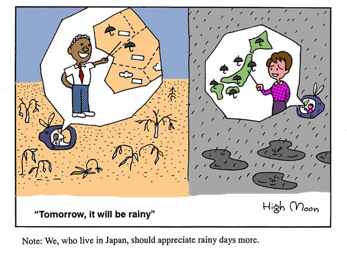 จากรายการพยากรณ์อากาศที่พยากรณ์ว่าจะมีฝนตกทั่วทั้งประเทศญี่ปุ่น ในขณะที่บางประเทศมีฝนตกเพียงบางส่วนและหลายส่วนยังเกิดปัญหาความแห้งแล้ง ซึ่งผู้เขียนได้บอกให้ผู้อ่านที่เป็นชาวญี่ปุ่นรู้สึกว่าควรที่จะต้องดีใจที่ในญี่ปุ่นนั้นยังมีวันที่ฝนตกมาก หากก็เป็นการเตือนใจให้ทราบถึงสถานการณ์โลกร้อนที่กำลังมีมากขึ้น และก็ทำให้ให้ในบางพื้นที่เกิดปัญหาความแห้งแล้งแล้ว ดังนั้นคนในประเทศญี่ปุ่นซึ่งบางครั้งรู้สึกเบื่อหน่ายต่อฝนที่ตกป็นประจำควรดีใจที่ได้อยู่ในประเทศที่มีที่มีฝนตก ส่วนไทยเรานั้นก็ควรจะดีใจที่ยังไม่มีพื้นที่แห้งแล้งจนต้นไม้เที่ยวแห้งตายมากนัก แต่ก็ไม่ควรวางใจควรที่จะเริ่มตะหนักถึงปัญหาที่กำลังจะเกิดขึ้นมาในอนาคต เพราะจากสภาพปัจจุบันจะพบว่าไทยเราเริ่มมีปัญหาความแห้งแล้งในหลายพื้นที่ และหากสถานการณ์โลกร้อนที่กล่าวถึงกันอยู่นั้น เริ่มมากขึ้นและส่งผลกระทบต่อเรา ปัญหาความแห้งแล้งก็คงจะเริ่มมีมากขึ้น จนอาจส่งผลต่อการเกษตรกรรมที่ถึงเป็นรายได้หลักของประเทศเราได้ ภาพการ์ตูนนี้แสดงให้เห็นถึงการเปลี่ยนแปลงสภาพอากาศในประเทศญี่ปุ่น โดยในภาพด้านซ้ายแสดงถึงอากาศที่แห้งแล้งจนแม่น้ำมีรอยร้าว และผู้คนต้องกางร่มเพื่อป้องกันแสงแดดที่ร้อนจัด ทั้งสองภาพแสดงให้เห็นถึงสภาพอากาศที่เปลี่ยนแปลงอย่างรุนแรง ซึ่งเป็นผลมาจากภาวะโลกร้อน