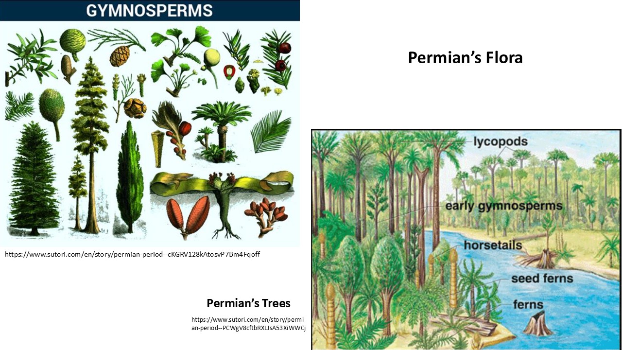 พืชตระกูล fern ได้แก่ Lycophytes, sphenopsids (like Calamites) ที่มีอย่างแพร่หลายในต้นยุคที่มีสภาพอากาศร้อนชื้น เปลี่ยนเป็นพืชที่มีเมล็ดไม่มีดอก ตระกูล gymnosperms มีความคงทนต่อความแห้งแล้งในปลายยุค เช่น Glossopterids, พืชตระกูลต้นสน (Conifers) พืชตระกูลแป๊ะก้วย (Ginkgophytes และcycads) ที่ทนสภาพอากาศแล้งได้ดีกว่า