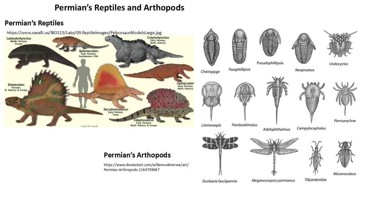 พืชและสัตว์ของยุคเพอร์เมียน เกิดการเปลี่ยนแปลง และมีการวิวัฒนาการอย่างมากโดยเฉพาะสิ่งมีชีวิตบนบก เนื่องจากการเปลี่ยนแปลงสภาพอากาศโลกของยุคเพอร์เมียน จากอากาศร้อนชื้นในต้นยุค เปลี่ยนเป็นอากาศรุนแรง แห้งแล้ง หนาวจัด ร้อนจัดในปลายยุค