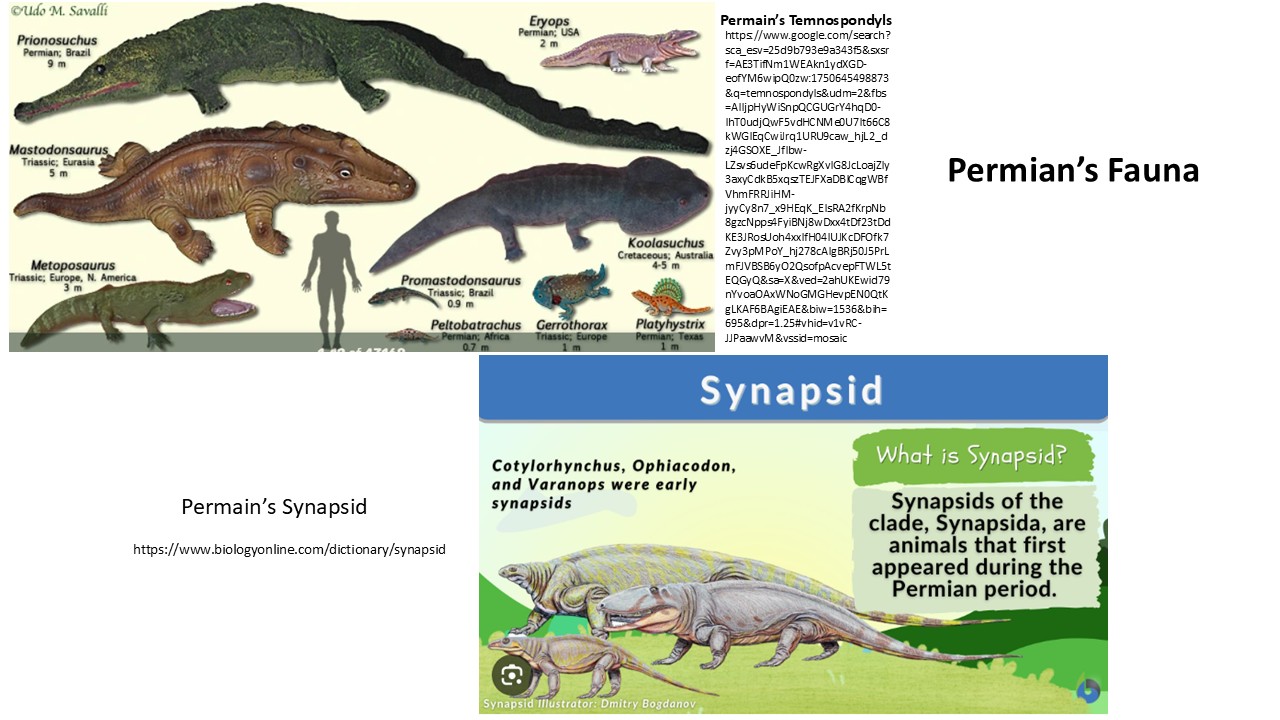 สัตว์ จำพวก Amphibians ยังมีอย่างแพร่หลายในต้นยุค และมีขนาดใหญ่โตขึ้นมากกว่าในยุค คาร์บอนิเฟอรัส เช่น temnospondyls สัตว์ จำพวก Amphibians ถูกแทนที่ด้วยสัตว์จำพวก Reptiles (สัตว์เลื้อยคลาน) และ Synapsids (สัตว์เลื้อยคลานที่เลี้ยงลูกด้วยน้ำนมต้นกำเนิด) ที่ทนอากาศแห้งแล้งได้ดีกว่า ยุคนี้ถือว่าเป็น age of synapsids เกิดสัตว์เลื้อยคลานเลี้ยงลูกด้วยนมครั้งแรกในโลก และมีการวิวัฒนาการจนเป็นสัตว์ที่มีขนาดใหญ่ที่สุดในยุคนั้น