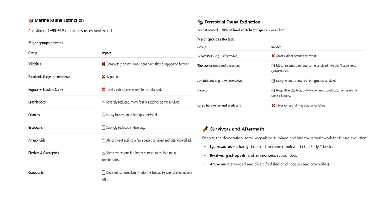 สาเหตุต่าง ๆ ตามที่กล่าวมาแล้วทำให้สิ่งมีชีวิตได้แก่ Marine extinction~90–96% of species, Terrestrial vertebrate extinction~70% of species, และเป็นครั้งแรกที่เกิดการสูญพันธ์ของแมลงยักษ์ต่าง ๆ จำนวนมาก