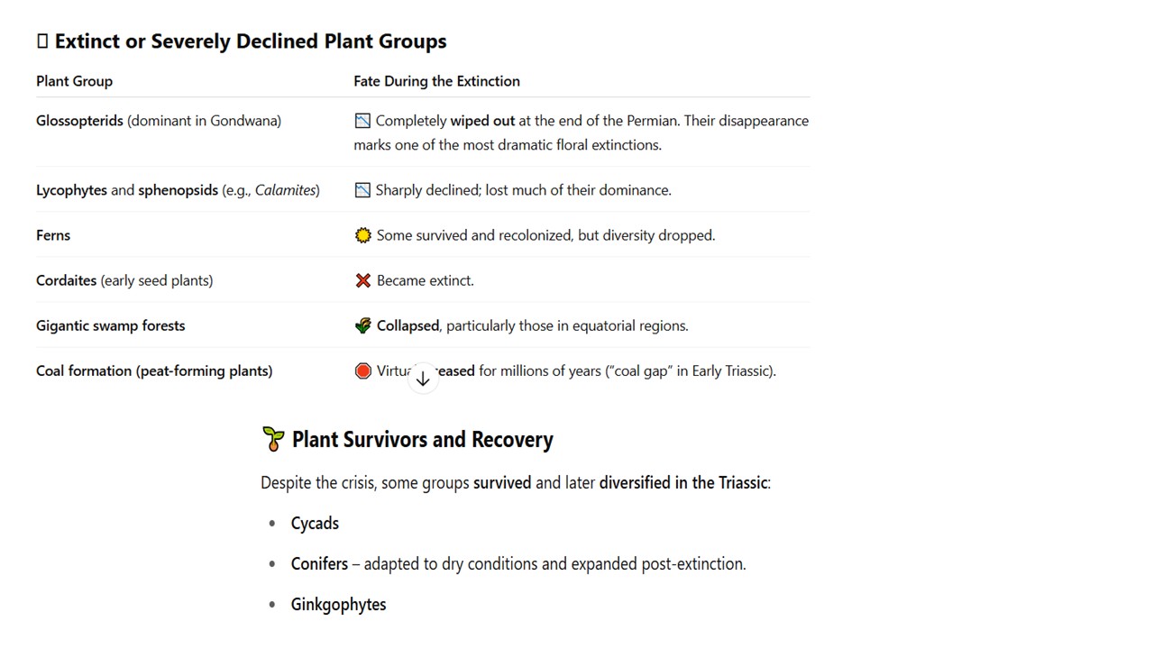 การสูญพันธ์ของพืชเกิดจาก สภาวะฝนกรด ไฟป่า ความแห้งแล้ง และการเกิดทะเลทราย และการเกิดโรคพืช พืชที่มีการสูญพันธ์ได้แก่ Glossopterids (เฟิรน์ที่มีเมล็ดมีใบเหมือนลิ้น) Cordaites (ต้นสนพันธ์แรก) Lycophytes and sphenopsids ลดลงอย่างรวดเร็ว การลดลงอย่างฉับพลันของป่าพลุชื้นที่ให้ชั้นถ่านหินหมดไปอย่างทันที่ทันใด