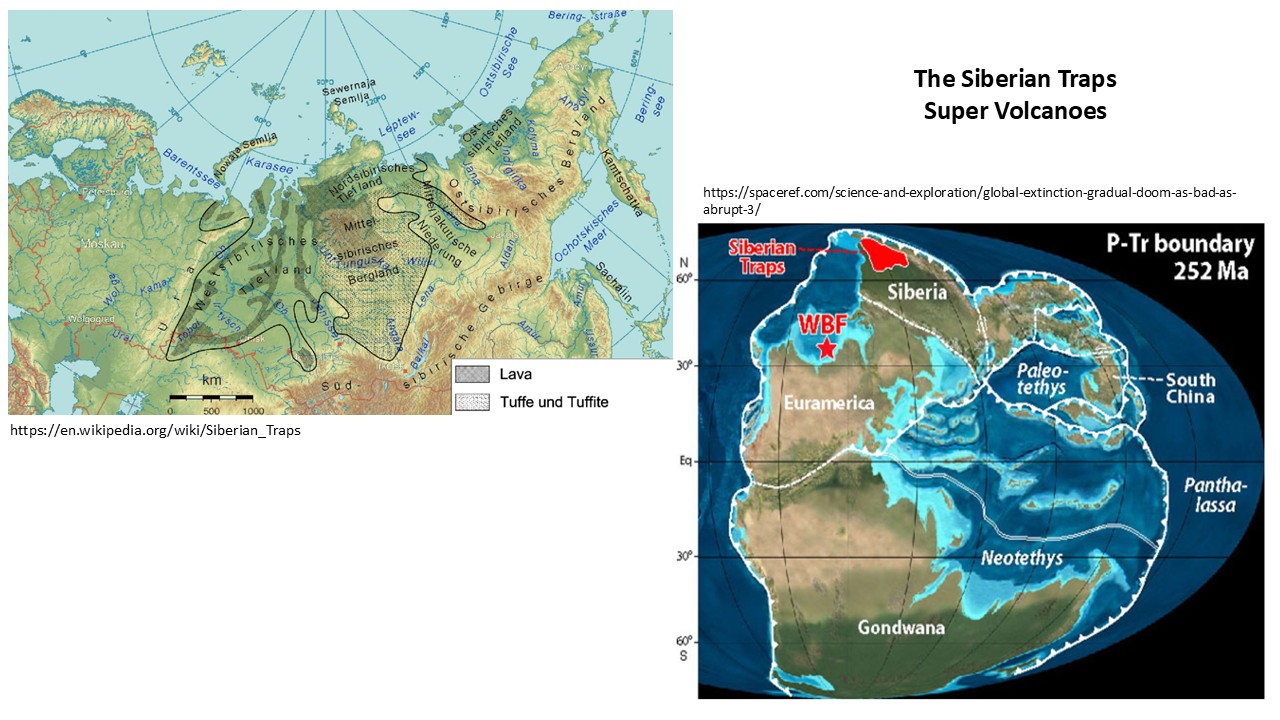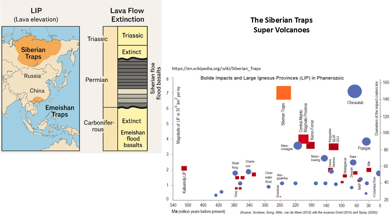 Siberian Traps เป็นการระเบิดของภูเขาไฟขนาดใหญ่ (super volcanoes) ที่ใหญ่ที่สุดในบันทึกทางธรณีวิทยาในรอบ 500 ล้านปี เกิดขึ้นในบริเวณที่ปัจจุบันเป็นแคว้นไซบีเรีย ของรัสเซีย เหตุการณ์นี้เกิดขึ้นเมื่อ 251.9 Ma. (late Permian) เกิดจากการประทุของแมกมาจากชั้นmantle (mantle plume) ทำให้เกิดการไหลบ่าของ lava (massive flood basalt eruptions) ที่ต่อมาแข็งตัวเป็นหิน basalt, dolerite, gabbro, minor rhyolite และpyroclastic flows เกิด Large Igneous Province (LIP) คลุมพื้นที่มากกว่า 7 ล้านตารางกิโลเมตร คิดเป็นปริมาตรมากกว่า 4 ล้านลูกบาศก์กิโลเมตร แรกเริ่มมีการไหลบ่าของลาวาอยู่ 6หมื่นปี จากนั้นมีการไหลบ่าหลายละลอกกินเวลารวมประมาณ 1 ล้านปี ทำให้เกิดภูเขาที่ราบสูง แบบขั้นบันได (traps, เป็นภาษาสวีเดน trappa = stairs) การระเบิดครั้งนี้ทำให้เกิดการเปลี่ยนแปลงสภาพภูมิอากาศ และน้ำทะเล ทำให้เกิดการสูญพันธ์ครั้งใหญ่ที่สุดในโลกตามบันทึกทางธรณีวิทยา