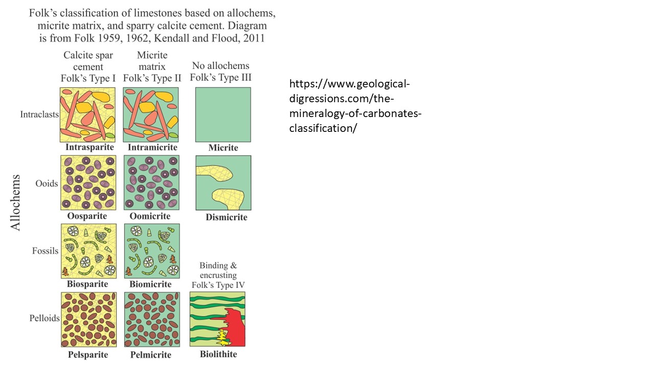 การจำแนกชนิดหินคาร์บอเนต ในปัจจุบันนิยมใช้การจำแนกแบบ Folk Classification และ Dunham Classification