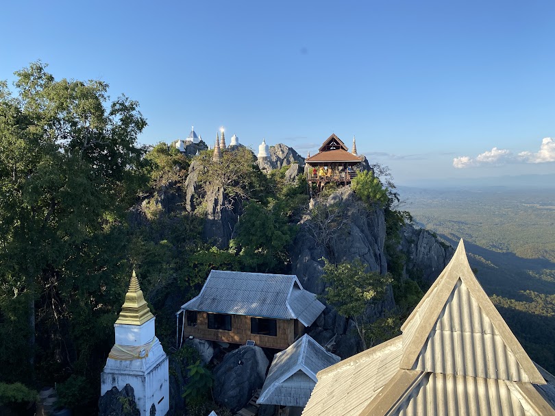 เมื่อมองไปทางขวาจะเห็นเป็นวิวขององค์พระธาตุสีทองบนยอดเขา และหากมองมาทางซ้ายจะเห็นเจดีย์สีขาว 5 องค์อยู่ริมชะง่อนผา หินไกลๆ มองแล้วก็ต้องทึ่งว่าใครหนอช่างมีความพยายามไปสร้างเจดีย์ไว้ในที่ที่แม้แต่เดินตัวเปล่าก็ยังยากลำบากแต่ด้วยแรงศรัทธา ของ มนุษย์ก็สามารถทำเรื่องที่ไม่น่าเป็นไปได้ให้เกิดขึ้นได้อย่างน่ามหัศจรรย์