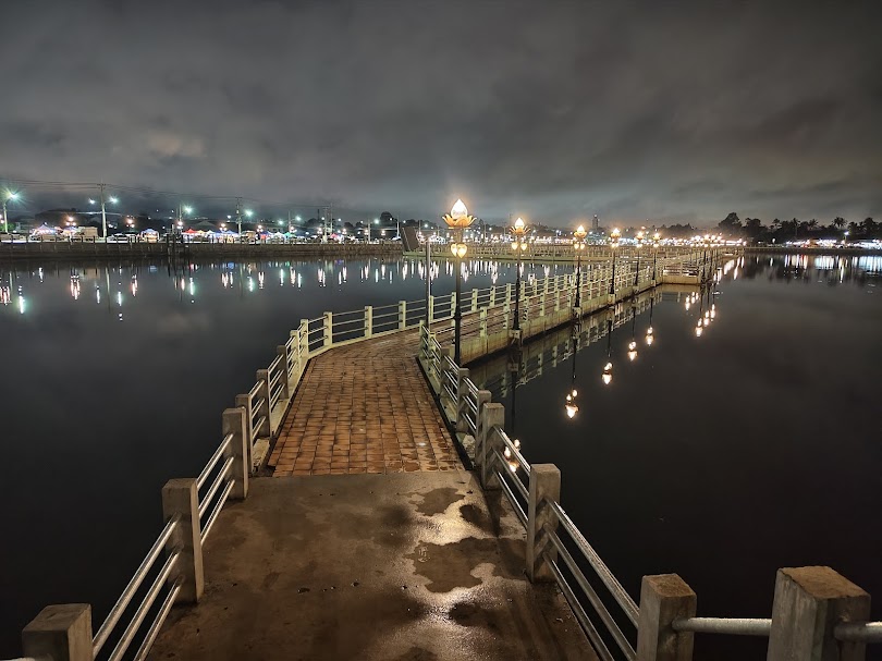 เมื่อตะวันลับขอบฟ้า สวนสาธารณะแห่งนี้กลับมีชีวิตชีวาขึ้นอีกครั้งด้วยแสงไฟระยิบระยับจากร้านอาหารมากมายที่รายล้อม เปิดเป็นเทศกาลแห่งรสชาติและเสียงหัวเราะ ผู้คนจากทั่วสารทิศมารวมตัวกันเพื่อลิ้มลอง "หมูกระทะ" และ "จิ้มจุ่ม" อันเลื่องชื่อ กลิ่นหอมของเนื้อย่างและน้ำซุปเดือดพล่านคลุ้งไปทั่วบริเวณ เคล้าคลอไปกับเสียงเพลงบรรเลงเบาๆ ที่ถูกคัดสรรมาอย่างดี เพื่อสร้างสรรค์บรรยากาศแห่งการผ่อนคลายและสังสรรค์ น้ำพุหลากสีสันพวยพุ่งขึ้นสู่ท้องฟ้า ย้อมค่ำคืนให้งดงามราวกับอยู่ในห้วงฝัน เป็นภาพที่ตราตรึงใจผู้มาเยือนมิรู้ลืม ห้วยวังนองจึงไม่ใช่เพียงแค่สวนสาธารณะ แต่เป็นดั่งปอดและหัวใจของชาวอุบลฯ เป็นสถานที่ที่เชื่อมโยงผู้คนเข้าไว้ด้วยกัน ผ่านกิจกรรมยามว่าง อาหารรสเลิศ และความงดงามของธรรมชาติ ที่นี่ คุณจะได้สัมผัสกับเสน่ห์อันแท้จริงของอุบลราชธานี ที่ซึ่งชีวิตเมืองผสานเข้ากับความสงบของธรรมชาติได้อย่างลงตัว และที่ซึ่งทุกย่างก้าวคือการค้นพบความสุขเล็กๆ น้อยๆ ในแต่ละวัน