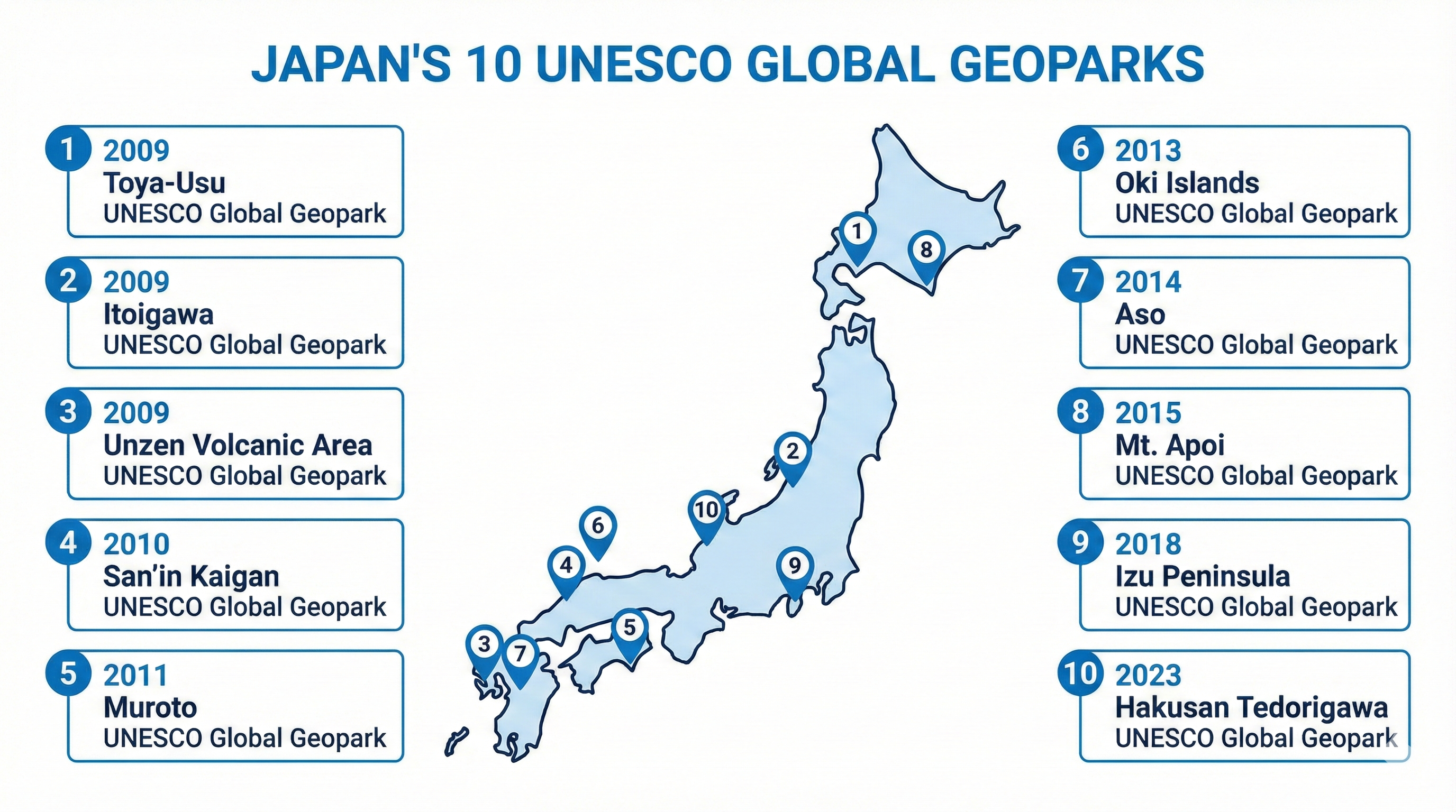 อุทยานธรณีโลกยูเนสโกของญี่ปุ่นตั้งกระจายอยู่ทั่วประเทศ ครอบคลุมความหลากหลายทางธรณีวิทยาอันน่าทึ่ง ตั้งแต่ภูมิประเทศภูเขาไฟที่ยังคุกรุ่นไปจนถึงชายฝั่งทะเลที่ถูกกัดเซาะอย่างงดงาม แต่ละแห่งมีเอกลักษณ์เฉพาะตัวที่บอกเล่าเรื่องราวการก่อกำเนิดของหมู่เกาะญี่ปุ่น อุทยานธรณีโลกยูเนสโกของญี่ปุ่นทั้ง 10 แห่ง ได้แก่
