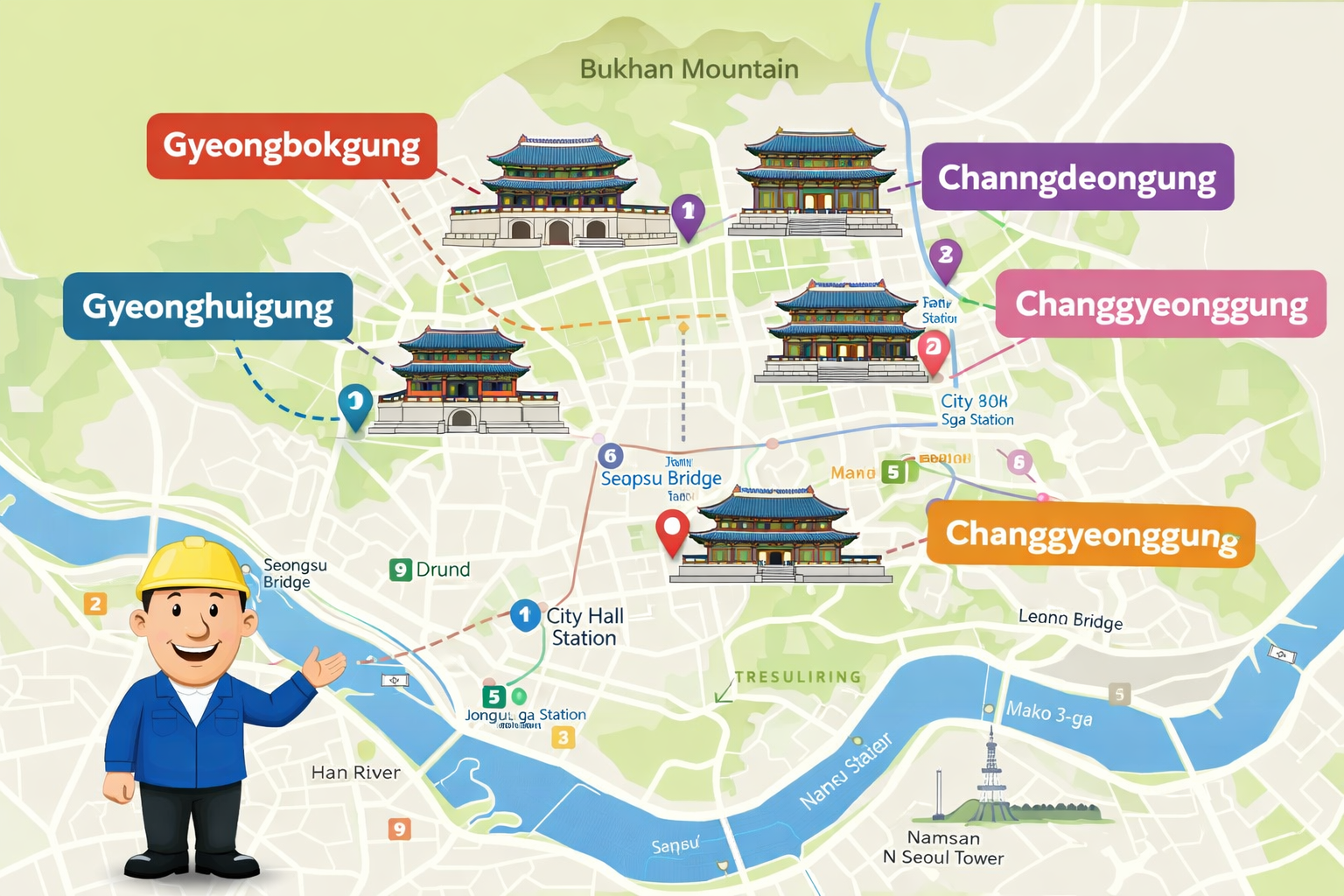 - พระราชวังเคียงบกกุง (Gyeongbokgung Palace) เป็นพระราชวังหลัก สร้างขึ้นในปี ค.ศ. 1395 มีท้องพระโรงกึนจองจอนและศาลาคยองฮเวรูเป็นจุดเด่น โครงสร้างขนาดใหญ่สะท้อนศูนย์กลางอำนาจของราชวงศ์ เปรียบเสมือนหัวใจสำคัญของกรุงโซล สร้างขึ้นในปี ค.ศ. 1395 เคยเป็นที่ประทับของกษัตริย์ 13 พระองค์ของราชวงศ์โชซอน พระราชวังแห่งนี้โดดเด่นด้วยความยิ่งใหญ่ อลังการ และสถาปัตยกรรมอันงดงาม โดยเฉพาะ "ศาลาคึงโฮรู (Geunjeongjeon)" ซึ่งเป็นอาคารหลักของพระราชวัง ภายในพระราชวังยังมีสวนหย่อมอันร่มรื่น สระน้ำ เก๋งจีน และพิพิธภัณฑ์ที่รวบรวมโบราณวัตถุมากมาย